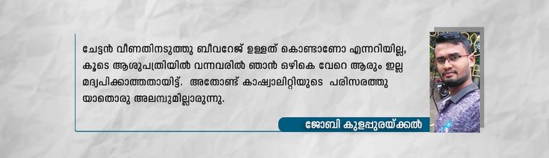 ചേട്ടന് വീണതിനടുത്തു ബീവറേജ് ഉള്ളത് കൊണ്ടാണോ എന്നറിയില്ല, കൂടെ ആശുപത്രിയില് വന്നവരില് ഞാന് ഒഴികെ വേറെ ആരും ഇല്ല മദ്യപിക്കാത്തതായിട്ട്. അതോണ്ട് കാഷ്വാലിറ്റിയുടെ പരിസരത്തു യാതൊരു അലമ്പുമില്ലാരുന്നു.