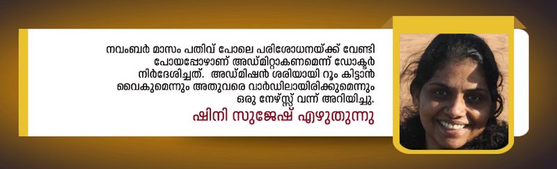 നവംബർ മാസം പതിവ് പോലെ പരിശോധനയ്ക്ക് വേണ്ടി പോയപ്പോഴാണ് അഡ്മിറ്റാകണമെന്ന് ഡോക്ടർ നിർദേശിച്ചത്. അഡ്മിഷൻ ശരിയായി റൂം കിട്ടാൻ വൈകുമെന്നും അതുവരെ വാർഡിലായിരിക്കുമെന്നും ഒരു നേഴ്സ്സ് വന്ന് അറിയിച്ചു. അവർ ഞങ്ങളെയും കൂട്ടി വാർഡിലേക്ക് പോയി. വാർഡിലേക്ക് കയറുമ്പോൾ തന്നെ ചങ്കിടിപ്പ് കൂടുന്നുണ്ടായിരുന്നു. അവിടെ പകുതിയിൽ അധികവും പ്രസവം കഴിഞ്ഞവർ ആയിരുന്നു. ഓപ്പറേഷൻ കഴിഞ്ഞ് ബെഡ്ഡിൽ നിന്നും പരസഹായം കൂടാതെ അനങ്ങാൻ പോലും സാധിക്കാതെ കഷ്ടപ്പെടുന്ന കുറേ പേർ. അവരുടെ മുഖത്തേക്ക് നോക്കുമ്പോൾ ആ വേദന എന്നിലേക്കും പടരുന്ന പോലെ ഒരു അനുഭവം. മനസ്സിനെ സ്വയം ശക്തിപ്പെടുത്തിയ നിമിഷങ്ങൾ. അവിടെ ഓരോ അമ്മമാരോടൊപ്പവും ചേർന്ന് കിടന്ന കുഞ്ഞുങ്ങളെ കണ്ടപ്പോൾ, അവരുടെ നേരിയ കരച്ചിൽ കേട്ടപ്പോൾ വേദനയൊന്നും ഒന്നുമല്ല എന്ന് സ്വയം സമാധാനിച്ച രാത്രി.