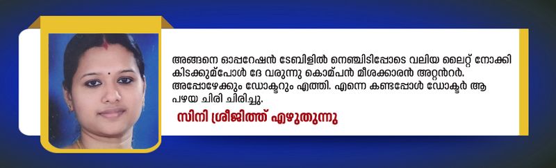 ഓപ്പറേഷൻ ടേബിളിൽ നെഞ്ചിടിപ്പോടെ വലിയ ലൈറ്റ് നോക്കി കിടക്കുമ്പോൾ ദേ വരുന്നു കൊമ്പൻ മീശക്കാരൻ അറ്റന്റർ. അപ്പോഴേക്കും ഡോക്ടറും എത്തി. എന്നെ കണ്ടപ്പോൾ ഡോക്ടർ ആ പഴയ ചിരി ചിരിച്ചു. ആ ചിരിക്ക് പിന്നിൽ ഒരു കഥയുണ്ട്. അതെന്താണെന്നു വെച്ചാൽ, വിശേഷമുണ്ടെന്ന ഡൗട്ടിൽ ഡോക്ടറെ കാണിക്കാൻ പോയി.