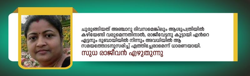 അങ്ങനെ ആശുപത്രിയില് അഡ്മിറ്റായി. ഓപ്പറേഷന് കഴിഞ്ഞു. പനിയും വിറയലും വന്നതിനാൽ പ്രതീക്ഷിച്ചതിലും കൂടുതല് ആശുപത്രിയില് കഴിയേണ്ടിയും വന്നു. അഡ്മിറ്റായ ദിവസം മുതൽ ഏട്ടനും ഭാര്യയും രാവിലെ തന്നെ ഭക്ഷണം ഒക്കെ എടുത്തോണ്ടു വരും. അവർ വന്നാലുടൻ രാജീവേട്ടൻ വീട്ടിലേക്ക് പോയി കുറച്ച് ഉറങ്ങി, കുളിച്ചു മാറ്റി, രാത്രിയിലെക്കുള്ള ഫുഡും എടുത്തോണ്ടു വരും. മറ്റാരെയും ബുദ്ധിമുട്ടിക്കരുതെന്ന് കരുതിയതിനാൽ ആരോടും ഒരു സഹായവും ചോദിച്ചിരുന്നില്ല. എന്നിട്ടും കണ്ടറിഞ്ഞ് രാജീവേട്ടന്റെ ചേച്ചി അവർക്ക് ആവശ്യമുള്ളതൊക്കെ പൊതിഞ്ഞെടുത്ത് ആശുപത്രിയില് വരികയും എന്നെ ഡിസ്ച്ചാർജ് ആയി വീട്ടിലെത്തിച്ച ശേഷമേ തിരികെ പോകുകയും ചെയ്തുള്ളൂ.