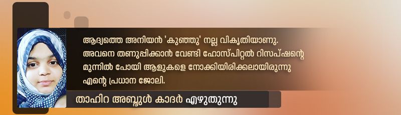 കുട്ടി നഴ്സുമാരുടെ സംരക്ഷണയിലാണ്. ഡിസ്ചാർജ് ചെയ്യുമ്പോഴേ നമ്മുടെ കയ്യിൽ കിട്ടുകയുള്ളൂ. വേണമെങ്കിൽ അവിടെ പോയി അവനെ കാണാം. വാപ്പയോടൊപ്പം ഞാൻ പോയി നോക്കി. വേറെയും ഒരുപാടു കുഞ്ഞുങ്ങളോടൊപ്പം ദാ കിടക്കുന്നു, എന്റെ രണ്ടാമത്തെ അനിയൻ.