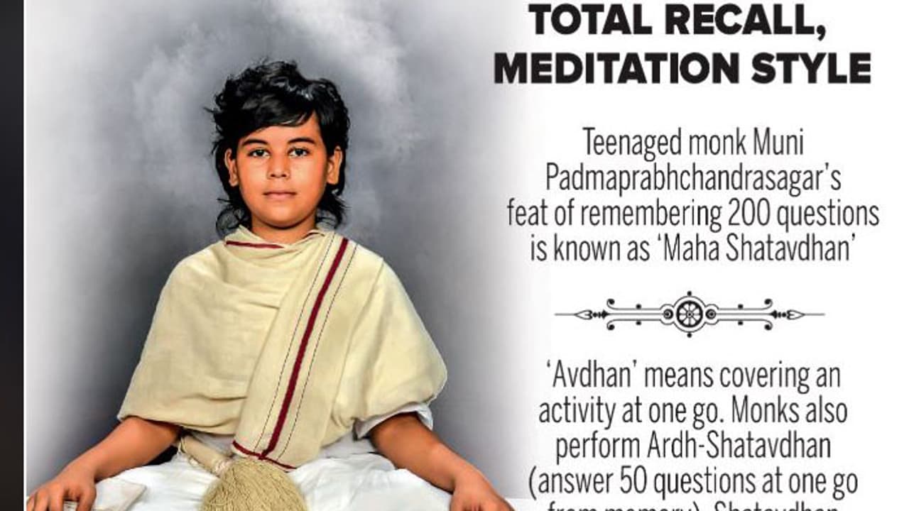 ബംഗളൂരു: അടുത്ത മാസം സെപ്റ്റംബർ രണ്ടാം തീയതി ബംഗളൂരുവിലെ പാലസ് ഗ്രൗണ്ട് ഒരു അസാധാരണ സംഭവത്തിന് വേദിയാകും. അന്നാണ് പതിനേഴ് വയസ്സുള്ള ജൈന സന്യാസി മുനി പദ്മപ്രഭചന്ദ്ര സാഗർ മഹാശതധ്വനിയായി പ്രഖ്യാപിക്കപ്പെടുന്നത്. പല വിഷയങ്ങളിലായി ഇരുന്നൂറ് ചോദ്യങ്ങളും അതിന്റെ ഉത്തരങ്ങളും ക്രമം തെറ്റാതെ പറയാൻ സാധിക്കുന്നവനാണ് 'മഹാശതധ്വനി' എന്നറിയപ്പെടുന്നത്. അതായത് ഇരൂന്നൂറ് ചോദ്യങ്ങളും അതിന്റെ ഉത്തരങ്ങളും ക്രമം തെറ്റാതെ പറയും എന്നതാണ് ഈ സന്യാസിയുടെ പ്രത്യേകത. അതിലെന്താണിത്ര പ്രത്യേകത എന്ന് ചോദിക്കാൻ വരട്ടെ.