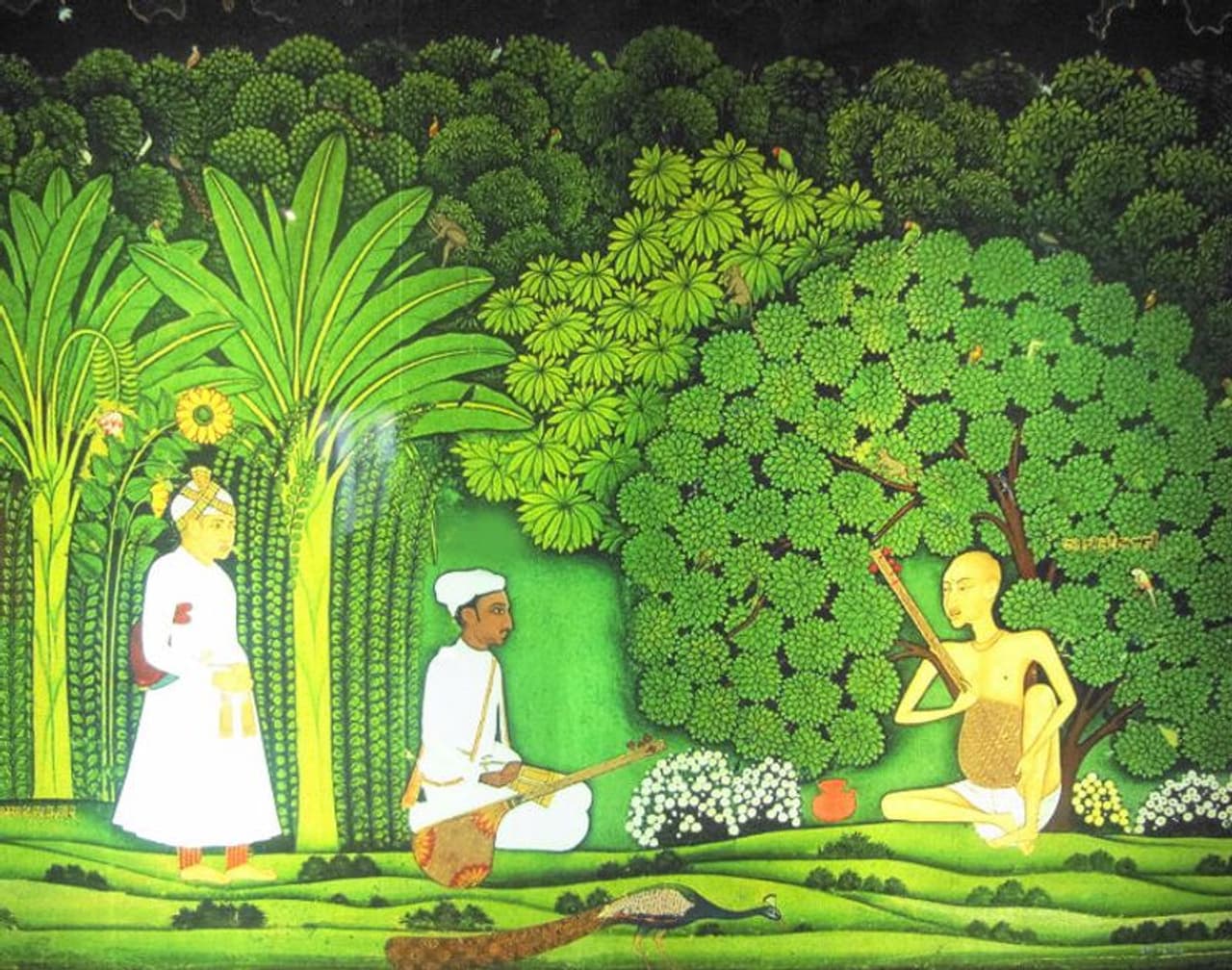 'സ്വാമി ഹരിദാസില് നിന്നും ഹിന്ദുസ്ഥാനി സംഗീതം അഭ്യസിക്കുന്ന താന്സെന്, കണ്ടു നില്ക്കുന്ന അക്ബര്. ഒരു പഴയ പെയിന്റിങ്.'