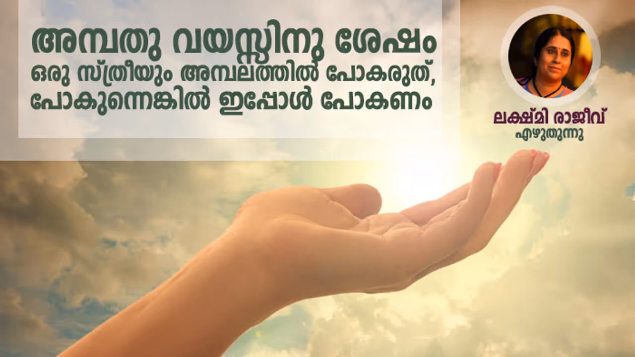 അമ്പതു വയസ്സിനു ശേഷം ഒരു സ്ത്രീയും അമ്പലത്തിൽ പോകരുത്. അയ്യപ്പൻ ഇങ്ങോട്ടു വന്നു കാണട്ടെ. പോകുന്നെങ്കിൽ ഇപ്പോൾ പോണം. തലയിലെ ഭാരം ഇറക്കി വച്ച്, കൂട്ടുകാർക്കൊപ്പം പമ്പയിൽ നീന്തി കുളിച്ച്, സന്ധ്യക്ക്,