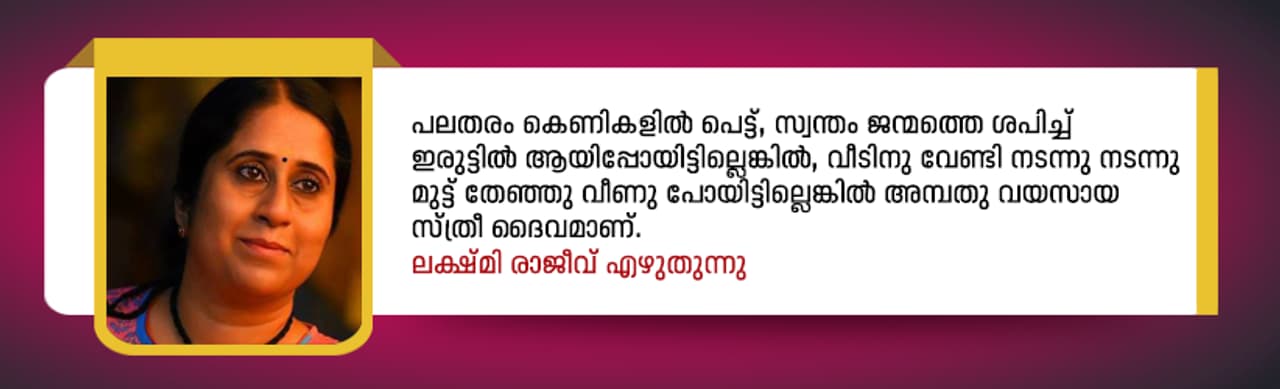 ആരും സ്ത്രീധനത്തിന്റെ പേരിൽ തല്ലി കൊന്നില്ലെങ്കിൽ, നെഞ്ചിൽ ക്യാൻസറോ മറ്റോ വന്നു മരിച്ചില്ലെങ്കിൽ, കൂട്ട ബലാത്സംഗം ചെയ്തു റോഡിൽ എറിഞ്ഞിട്ടില്ലെങ്കിൽ, മക്കൾ പോയി ചത്തുകൂടെ എന്ന് ചോദിച്ചിട്ടില്ലെങ്കിൽ, പലതരം കെണികളിൽ പെട്ട് സ്വന്തം ജന്മത്തെ ശപിച്ച് ഇരുട്ടിൽ ആയിപ്പോയിട്ടില്ലെങ്കിൽ, വീടിനു വേണ്ടി നടന്നു നടന്നു മുട്ട് തേഞ്ഞു വീണു പോയിട്ടില്ലെങ്കിൽ അമ്പതു വയസായ സ്ത്രീ ദൈവമാണ്.