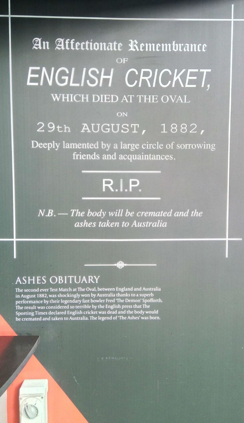 പിന്നെയും 10 വര്ഷങ്ങള്ക്ക് ശേഷം ഇതേ ഓവലില് ഓസ്ട്രേലിയയ്ക്കെതിരെ വെറും 85 റണ്സ് ചേസ് ചെയ്ത ഇംഗ്ലണ്ട് ഒരു വിക്കറ്റിന് 52 എന്ന നിലയില് നിന്നും 78 റണ്സിന് ഓള് ഔട്ട് ആയി. അവിശ്വസനീയമായി തോറ്റതിന്റെ പിറ്റേന്നാള്, കൃത്യമായി പറഞ്ഞാല് 1882 ആഗസ്റ്റ് 29 -ന് സ്പോര്ട്സ് ടൈംസ് പത്രം ഇങ്ങനെ എഴുതി- 'ഓവലില് ഇംഗ്ലീഷ് ക്രിക്കറ്റ് മരിച്ചിരിക്കുന്നു... ആ ദീപ്തസ്മരണയ്ക്ക് നിത്യശാന്തി.. മൃതദേഹം സംസ്കരിച്ച ശേഷം ചിതാഭസ്മം ഓസ്ട്രേലിയയിലേക്ക് കൊണ്ടുപോകും...' ആഷസ് എന്ന ബദ്ധ വൈരത്തിന്റെ കഥ അന്ന് അവിടെ തുടങ്ങുകയായിരുന്നു. ആ ആഷസ് ഇന്നും അതേ കളിമണ് കോപ്പയില് ലോര്ഡ്സിലെ MCC മ്യുസിയത്തില് സൂക്ഷിച്ചിരിക്കുന്നു.