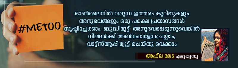 ഓൺലൈനിൽ വരുന്ന ഇത്തരം കുറിപ്പുകളും അനുഭവങ്ങളും ഒരു പക്ഷെ പ്രയാസങ്ങൾ സൃഷ്ടിച്ചേക്കാം. ബുദ്ധിമുട്ട് അനുഭവപ്പെടുന്നുവെങ്കിൽ നിങ്ങൾക്ക് അൺഫോളോ ചെയ്യാം, വാട്ട്സ്ആപ്പ് മ്യൂട്ട് ചെയ്തു വെക്കാം, ബ്ലോക്ക് ചെയ്യാം. അതിന്റെ പേരിലൊന്നും കുറ്റബോധം തോന്നേണ്ടതില്ല. വേണ്ട എന്ന് തോന്നുന്ന സമയത്ത് സമൂഹ മാധ്യമങ്ങളിൽ നിന്ന് ഇടവേള എടുക്കുക, വേണം എന്ന് മനസു പറയുമ്പോൾ തിരിച്ചു വരാമല്ലോ