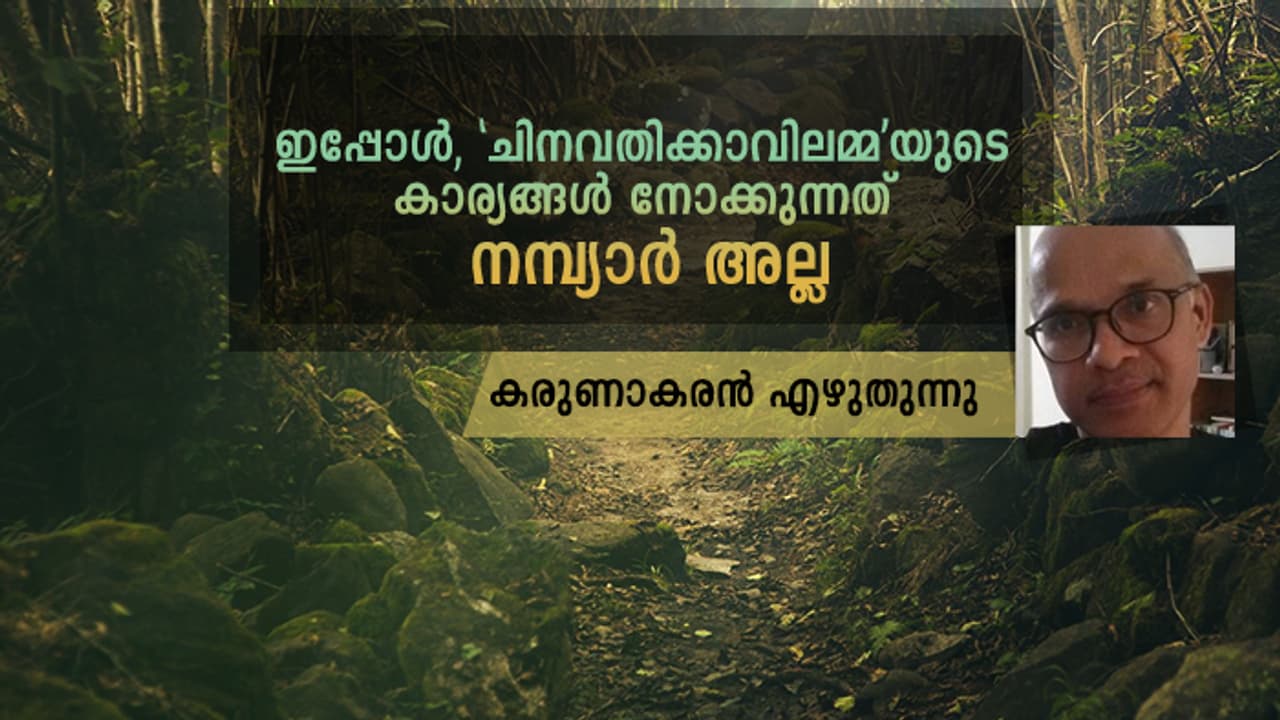 ഞാന് തൊഴുതിരുന്ന 'ഈശ്വരന്' ഒരു പെണ്ണാണ്. ഒരു നാടന് ഭഗവതി. ഞങ്ങള് ഒരുപാട് പേരുടെ ഭഗവതിയാണ്. മുത്തശ്ശിയാര്ക്കാവിലമ്മയുടെ നേരെ അനിയത്തി, 'ചിനവതിക്കാവിലമ്മ' എന്നാണ് പേര്. ‘എന്റെ തട്ടകം’എന്ന് ചുറ്റുമുള്ള മൂന്നോ നാലോ ഗ്രാമങ്ങളെയും 'എന്റെ മക്കള്' എന്ന് ഈ ഗ്രാമങ്ങളിലെ അത്രയും ആളുകളെയും ചിനവതിക്കാവിലമ്മ വിളിയ്ക്കും. അങ്ങനെ പറയുന്നത് കേള്ക്കാന് ഞങ്ങളുടെ വെളിച്ചപ്പാടിനെ ഒരുതവണ കേട്ടാല് മതി. പാല, ആല്, അരയാല് ഒക്കെയായിരുന്നു ‘കാവി’ലെ മരങ്ങള്, ഭഗവതി താമസിച്ചിരുന്നത് അവിടെയാണ്. അതിനാല് ഭഗവതിയെ ആരും കണ്ടിരുന്നില്ല. ഇടക്ക് ചിലരുടെ സ്വപ്നത്തിലോ, ഇടക്ക് ചിലര്ക്ക് രാത്രി വഴി തെറ്റുമ്പോഴോ, ഇടക്ക് കുട്ടികള്ക്ക് പനി പിടിക്കുമ്പോഴോ ഒന്ന് കണ്ടാലായി. അല്ലെങ്കില് ഇല്ല. അവിടേക്ക് വിളക്കുവെയ്ക്കാന് ഞങ്ങള് പോയിരുന്നു, പെണ്കുട്ടികളും, ആണ്കുട്ടികളും, ആണുങ്ങളും പെണ്ണുങ്ങളും ഒക്കെ. 'തീണ്ടാരി'യായ ദിവസങ്ങളില് 'പെണ്ണുങ്ങള്' വരില്ല. 'കുളിച്ചേ' പിന്നെ വരൂ. അതുകൊണ്ടുമാത്രം ‘കാണാന് പറ്റാതിരുന്ന, ഒപ്പം പഠിയ്ക്കുന്ന പെണ്കുട്ടി’യെ ഓര്ക്കുമ്പോള് ഇതാ, ഇപ്പോഴും ഒരു ഈഷലുണ്ട്.