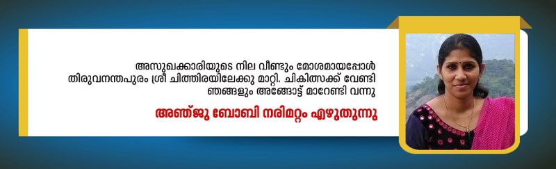 തിരുവനന്തപുരം ചെന്നു കഴിഞ്ഞപ്പോൾ താമസത്തിനും ഭക്ഷണത്തിനുമായി നല്ലൊരു തുക വേണം. ഉള്ളതെല്ലാം വിറ്റും പലരുടെയും മുന്നിൽ കൈ നീട്ടിയും ചികിത്സ തള്ളിനീക്കി. ദാരിദ്ര്യവും പോഷകാഹാര കുറവും മരണഭയവും ഒക്കെക്കൂടി ചേച്ചിയെ എല്ലുന്തിയ വിളറിയ ഒരു രൂപമാക്കി തീർത്തു.