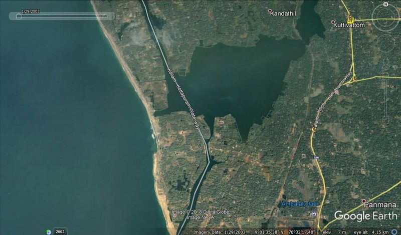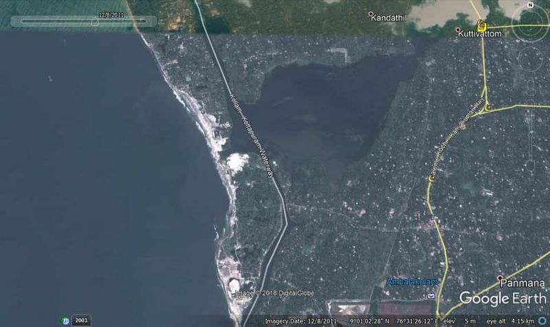 (c) പൊന്മനക്കും ആലപ്പാടിനും ഇടക്കുള്ള പ്രദേശത്ത് വലിയ തോതിൽ കടൽ കരയിലേക്ക് കയറി വരുന്നു. 2003 ന് മുമ്പു തന്നെ ആരോ ഈ കായലിൽ നിന്നും കടലിലേക്ക് ഒരു ചാനൽ ഉണ്ടാക്കാൻ ശ്രമിച്ചതു പോലെ ചിത്രത്തിൽ കാണുന്നുണ്ട്. ഇതാണിപ്പോഴത്തെ ഏറ്റവും ആപത് ശങ്കയുള്ള പ്രദേശം.