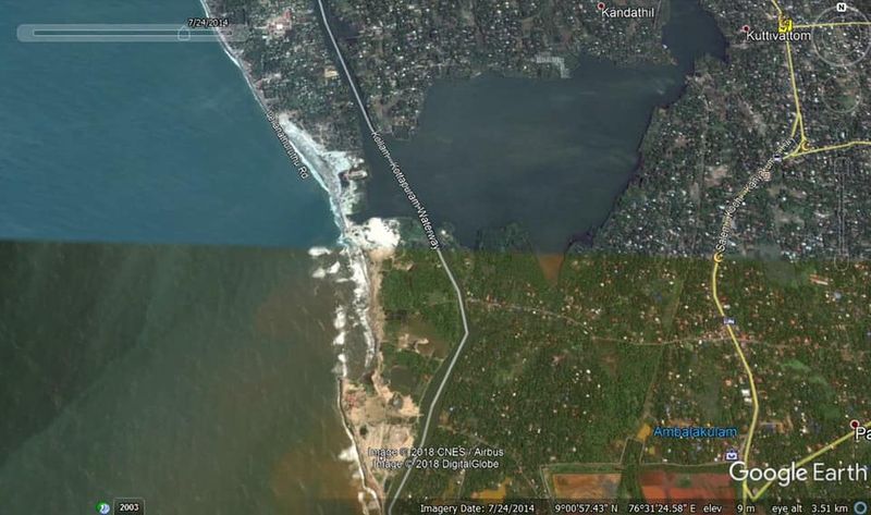 1.ആലപ്പാടിന്റെ ഭാവി എന്തായിരിക്കുമെന്നറിയാൻ വാസ്തവത്തിൽ ശാസ്ത്രീയമായ വലിയ അറിവോ പഠനങ്ങളോ വേണ്ട. ആലപ്പാടിന്റെ തെക്കേ അറ്റത്ത് വെള്ളനാതുരുത്ത് എന്ന സ്ഥലം തുടങ്ങി അതിൻറെ തെക്കേ പഞ്ചായത്തിലെ കാട്ടിൽ മേക്കേതിൽ ക്ഷേത്രം വരെയുള്ള സ്ഥലങ്ങളുടെ ഇപ്പോഴത്തെ സ്ഥിതിയും പതിനഞ്ചു കൊല്ലം മുന്പുള്ള സ്ഥിതിയും താരതമ്യം ചെയ്താൽ മാത്രം മതി. 2003 മുതൽ 2018 വരെയുള്ള കാലഘട്ടത്തിലെ പൊതുമണ്ഡലത്തിൽ ലഭ്യമായ ഉപഗ്രഹ ചിത്രങ്ങൾ ഇവിടെ ചേർക്കുന്നു. ഇപ്പോഴത്തെ പോലെ ഖനനം തുടർന്നാൽ ഈ പൊന്മന പ്രദേശം 2018 ൽ എങ്ങനെയായോ അങ്ങനെയാണ് നാളെ ആലപ്പാട് ആകാൻ പോകുന്നത്.