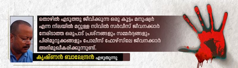 തൊഴിൽ എടുത്തു ജീവിക്കുന്ന ഒരു കൂട്ടം മനുഷ്യർ എന്ന നിലയില് മറ്റുള്ള സിവിൽ സർവീസ് ജീവനക്കാർ നേരിടാത്ത ഒരുപാട് പ്രശ്നങ്ങളും സമ്മർദ്ദങ്ങളും പിരിമുറുക്കങ്ങളും പോലീസ് ഫോഴ്സിലേ ജീവനക്കാർ അഭിമുഖീകരിക്കുന്നുണ്ട്. അതൊന്നും പക്ഷെ അവരുടെ വീഴ്ച്ചകളെയോ അവരിൽ ചിലരിൽ കാണുന്ന വൈകല്യങ്ങൾക്ക് ഒരു ന്യായീകരണമാവുന്നില്ല. എന്നാലും ചിലതൊക്കെ പറയേണ്ടിവരും.
