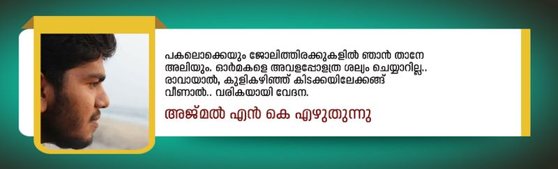 ഡിഗ്രി പഠനശേഷമുള്ള ഇടവേളയിലാണ് വിരഹം വരിഞ്ഞുമുറുക്കിയത്. അന്ന്, ചെന്നൈ നഗരത്തിലെ ഒരു ഹോട്ടലിൽ ജോലി ചെയ്യുകയായിരുന്നു. പകലൊക്കെയും ജോലിത്തിരക്കുകളിൽ ഞാൻ താനേ അലിയും. ഓർമകളെ അവള് അപ്പോളത്ര ശല്യം ചെയ്യാറില്ല.. രാവായാൽ, കുളികഴിഞ്ഞ് കിടക്കയിലേക്കങ്ങ് വീണാൽ.. വരികയായി വേദന. പിന്നീടുറങ്ങുംവരെ പാട്ടിന്റെ പിന്നാലെയാണ്. അവയിലേറ്റം പ്രിയപ്പെട്ടതേതെന്ന് ചോദിച്ചാൽ നിസ്സംശയം മധുസൂദനൻ നായർ മനസിലേക്കോടിയെത്തും.
