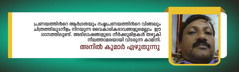 പ്രണയത്തിന്റെ ആർദ്രതയും നഷ്ടപ്രണയത്തിന്റെ വിങ്ങലും ചിത്രത്തിലുടനീളം നിറയുന്ന വൈകാരികഭാവങ്ങളെല്ലാം ഈ ഗാനത്തിലുണ്ട്. അഭിലാഷങ്ങളുടെ നീർക്കുമിളകൾ തഴുകി നീലത്താമരയായി വിടരുന്ന കാമിനി. നീർക്കുമിളകളെപ്പോലെ പൊലിഞ്ഞുതീരുന്ന പ്രണയം. പല്ലവിയിലെ പ്രകൃതി ബിംബങ്ങളെ അനുപല്ലവിയിലെ കാൽപനികബിംബങ്ങളുമായി സമുന്നയിപ്പിച്ചിരിക്കുന്ന രീതി എന്നിലെ ആസ്വാദകനെ വിസ്മയിപ്പിക്കുന്നു!!