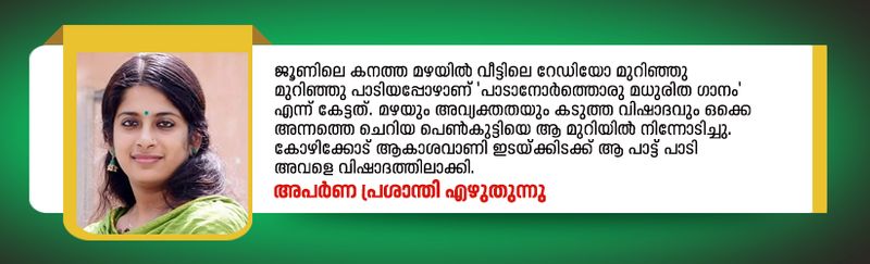 ജൂണിലെ കനത്ത മഴയില് വീട്ടിലെ റേഡിയോ മുറിഞ്ഞു മുറിഞ്ഞു പാടിയപ്പോഴാണ് 'പാടാനോര്ത്തൊരു മധുരിത ഗാനം' എന്ന് കേട്ടത്. മഴയും അവ്യക്തതയും കടുത്ത വിഷാദവും ഒക്കെ അന്നത്തെ ചെറിയ പെണ്കുട്ടിയെ ആ മുറിയില് നിന്നോടിച്ചു. കോഴിക്കോട് ആകാശവാണി ഇടയ്ക്കിടക്ക് ആ പാട്ട് പാടി അവളെ വിഷാദത്തിലാക്കി.