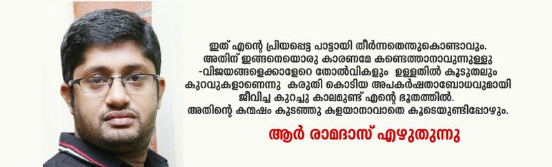 മതത്തിന്റെ പേരില് അരങ്ങുകളിലും ക്ഷേത്രങ്ങളിലും അപമാനിതനായി ഇറങ്ങിപ്പോവേണ്ടി വന്ന ഹൈദരാലിയുടെ ദുഃഖം മുഴുവന് തിങ്ങുന്ന ആലാപനമാണത്. പക്ഷേ, ഇത് എന്റെ പ്രിയപ്പെട്ട പാട്ടായി തീര്ന്നതെന്തുകൊണ്ടാവും. അതിന് ഇങ്ങനെയൊരു കാരണമേ കണ്ടെത്താനാവുന്നുള്ളു -വിജയങ്ങളെക്കാളേറെ തോല്വികളും ഉള്ളതില് കൂടുതലും കുറവുകളാണെന്നു കരുതി കൊടിയ അപകര്ഷതാബോധവുമായി ജീവിച്ച കുറച്ചു കാലമുണ്ട് എന്റെ ഭൂതത്തില്. അതിന്റെ കന്മഷം കുടഞ്ഞു കളയാനാവാതെ കൂടെയുണ്ടിപ്പോഴും.
