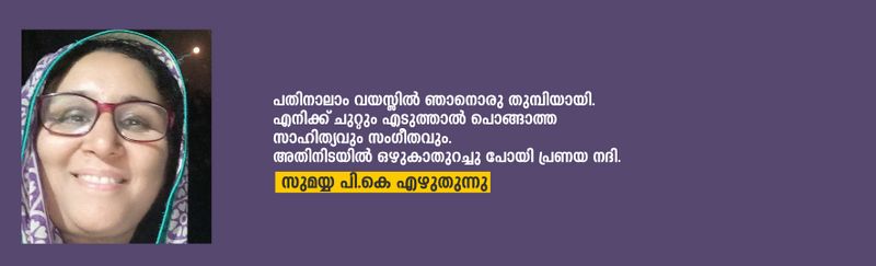 പതിനാലാം വയസ്സില് ഞാനൊരു തുമ്പിയായി. എനിക്ക് ചുറ്റും എടുത്താല് പൊങ്ങാത്ത സാഹിത്യവും സംഗീതവും. അതിനിടയില് ഒഴുകാതുറച്ചു പോയി പ്രണയ നദി.