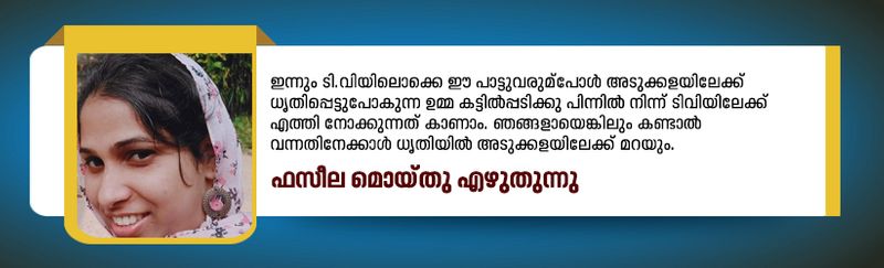 ഇന്നും ടി.വിയിലൊക്കെ ഈ പാട്ടുവരുമ്പോള് അടുക്കളയിലേക്ക് ധൃതിപ്പെട്ടുപോകുന്ന ഉമ്മ കട്ടില്പ്പടിക്കു പിന്നില് നിന്ന് ടിവിയിലേക്ക് എത്തി നോക്കുന്നത് കാണാം. ഞങ്ങളെയാരെയെങ്കിലും കണ്ടാല് വന്നതിനേക്കാള് ധൃതിയില് അടുക്കളയിലേക്ക് മറയും.