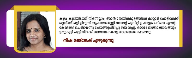 കാറ്റു കേറും കാട്ടിലെല്ലാം ഞാന് ഒറ്റയ്ക്ക് നടന്നു. കൂട്ടം കൂടിയിടത്ത് നിന്നെല്ലാം ഞാന് തേയിലക്കൂട്ടത്തിലെ കാറ്റാടി ചോട്ടിലേക്ക് ഒറ്റയ്ക്ക് ഒളിച്ചിരുന്ന് ആകാശമെണ്ണി. വയലറ്റ് പൂവിറ്റിച്ച കാട്ടുചെടിയെ എന്റെ കോളാമ്പി ചെടിയെന്നു ചേര്ത്തുപിടിച്ചു ഉമ്മ വച്ചു. ഓരോ മാങ്ങാക്കാലത്തും ഉപ്പുകൂട്ടി പുളിയിറക്കി അപ്പഴങ്കഥകളെ മറക്കാതെ കരഞ്ഞു.