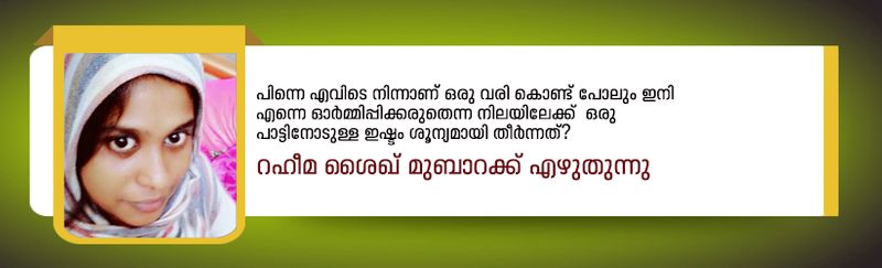 കേട്ട് കേട്ട് ഒടുവില് അച്ചടി പിഴവേതുമില്ലാതെ ഉമ്മ ആ വരികള് ജീവിതത്തിലേക്ക് പകർത്തിയെഴുതി തുടങ്ങിയെന്ന തിരിച്ചറിവുകളില് നിന്ന്, അർബുദത്തിന്റെ നോവുണർത്തുന്ന വരികള് അറംപറ്റല് പോലെ പ്രിയപ്പെട്ട ഒന്നിനെ എന്നില് നിന്ന് വേർപ്പെടുത്തി തുടങ്ങിയെന്ന പേടിപ്പെടുത്തലുകളില് നിന്ന്.. അങ്ങനെയെല്ലാമാകണം ആ ഇഷ്ടം, ഇഷ്ടമില്ലായ്മയിലേക്ക് പതിച്ചത്.