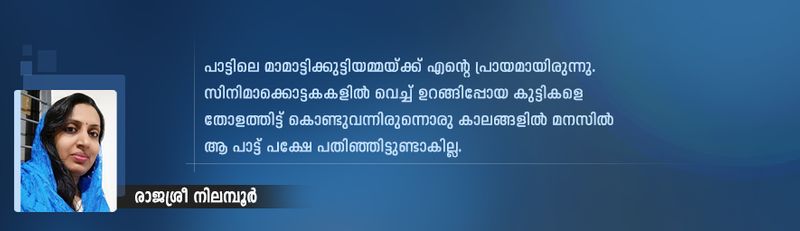 പാട്ടിലെ മാമാട്ടിക്കുട്ടിയമ്മയ്ക്ക് എന്റെ പ്രായമായിരുന്നു. സിനിമാക്കൊട്ടകകളില് വെച്ച് ഉറങ്ങിപ്പോയ കുട്ടികളെ തോളത്തിട്ട് കൊണ്ടുവന്നിരുന്നൊരു കാലങ്ങളില് മനസില് ആ പാട്ട് പക്ഷേ പതിഞ്ഞിട്ടുണ്ടാകില്ല. പിന്നെപ്പോഴോ ശാന്തികൃഷ്ണയെയും നെടുമുടി വേണുവിനെയും അയല്വീട്ടിലെ ടെലിവിഷനില് കണ്ടപ്പോഴും പാട്ടല്ലാതെ സിനിമാക്കഥ മനസില് പതിഞ്ഞില്ല. വീണ്ടും വളര്ന്നപ്പോഴാണ് കഥ മനസിലാകുന്നത്. അതെപ്പോഴും അങ്ങനെയാണല്ലോ- ഓരോ പ്രായത്തിലും പുനര്വായന അര്ഹിക്കുന്ന മഹാകാവ്യങ്ങള്.