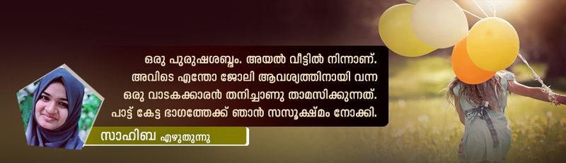 ഞങ്ങളുടെ വീടിന്റെ ജനലിലൂടെ നോക്കിയാൽ അവരുടെ വീട് വ്യക്തമായി കാണാമായിരുന്നു. ഞാൻ പലതവണ ജനലിലൂടെ എത്തിപ്പാളി നോക്കി. ആരെയും കണ്ടില്ല. നെഞ്ചിൽ ആ പാട്ടിങ്ങനെ ഉരുണ്ടുകേറാൻ തുടങ്ങിയപ്പോഴാണ് ഞാൻ ആ വീട്ടിൽ പുതിയതായി അരാ വന്നിരിക്കുന്നത് എന്ന് എന്റെ ചെറിയ മാമനോട് അന്വേഷിച്ചത്. "ആ വീട്ടിലെ ചെങ്ങായീന്റെ കുടുംബക്കാരു വിരുന്നു വന്നതാണത്". സ്വതവെ ഉണ്ടക്കണ്ണുള്ള എന്റെ മാമൻ കണ്ണുരുട്ടി പറഞ്ഞു.