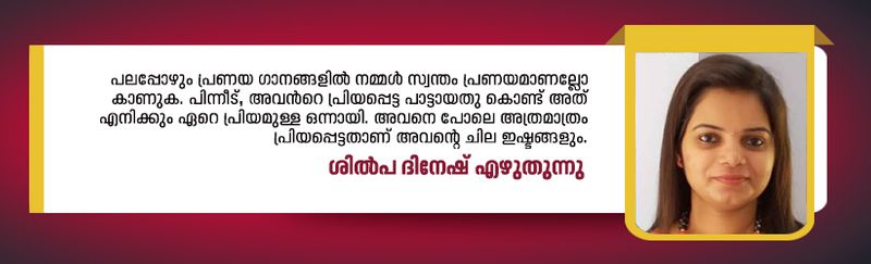 പലപ്പോഴും പ്രണയ ഗാനങ്ങളിൽ നമ്മൾ സ്വന്തം പ്രണയമാണല്ലോ കാണുക. പിന്നീട്, അവന്റെ പ്രിയപ്പെട്ട പാട്ടായതു കൊണ്ട് അത് എനിക്കും ഏറെ പ്രിയമുള്ള ഒന്നായി. അവനെ പോലെ അത്രമാത്രം പ്രിയപ്പെട്ടതാണ് അവന്റെ ചില ഇഷ്ടങ്ങളും.