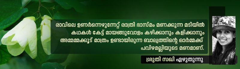 അമ്മമ്മക്കൂട്ട് മാത്രം ഉണ്ടായിരുന്ന ബാല്യത്തിന്റെ ഓർമ്മക്ക് പവിഴമല്ലിയുടെ മണമാണ്