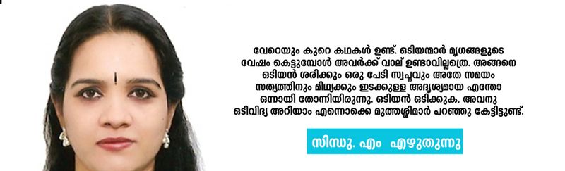 ഒടിയന്റെ ഭാര്യയുടെയും കാമുകിയുടേയുമൊക്കെ സ്ഥിതി എന്താകുമെന്നൊക്കെ ഓർത്തു നോക്കിയിട്ടുണ്ട്. ഒരു ഒടിയനെ പോലും ഇതുവരെ കണ്ടു കിട്ടിയിട്ടില്ല. അദൃശ്യരായി ഇരുട്ടിൽ മറഞ്ഞിരിക്കുന്നു എന്നും ഒടിയന്മാർ.