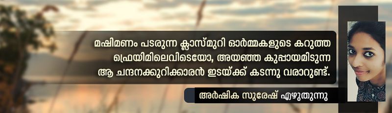 മഷിമണം പടരുന്ന ക്ലാസ്മുറി ഓർമ്മകളുടെ കറുത്ത ഫ്രെയിമിലെവിടെയോ, അയഞ്ഞ കുപ്പായമിടുന്ന ആ ചന്ദനക്കുറിക്കാരൻ ഇടയ്ക്ക് കടന്നു വരാറുണ്ട്. അധ്യാപകരുടെ പ്രാക്ക് വാങ്ങി വെളിയിൽ സ്ഥിര സാന്നിധ്യമായിരിക്കുന്ന പ്രതിഷ്ഠ. അതായിരുന്നു അവന്. നോട്ട് പകർത്തിയെടുക്കാൻ ഇടയ്ക്ക് സമീപിക്കാറുണ്ട് എന്നതിലുപരി പരസ്പരം പറയാൻ തക്ക ബന്ധങ്ങളൊന്നും ഞങ്ങൾക്കിടയിലുണ്ടായിരുന്നില്ല.