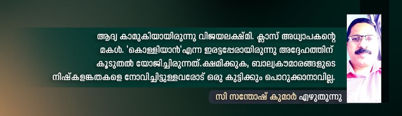 ആദ്യ കാമുകിയായിരുന്നു വിജയലക്ഷ്മി. ക്ലാസ് അധ്യാപകന്റെ മകള്. 'കൊള്ളിയാന്' എന്ന ഇരട്ടപ്പേരായിരുന്നു അദ്ദേഹത്തിന് കൂടുതല് യോജിച്ചിരുന്നത്. ക്ഷമിക്കുക, ബാല്യകൗമാരങ്ങളുടെ നിഷ്കളങ്കതകളെ നോവിച്ചിട്ടുള്ളവരോട് ഒരു കുട്ടിക്കും പൊറുക്കാനാവില്ല.
