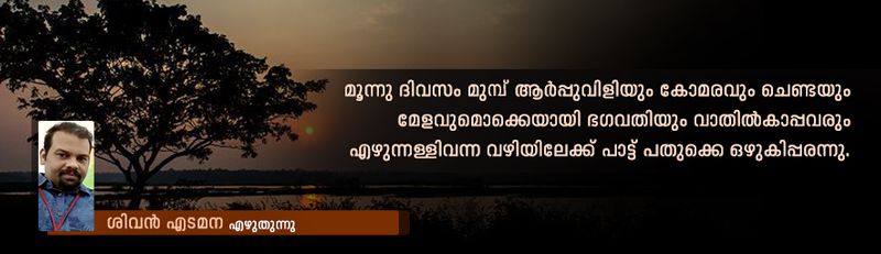 മൂന്നു ദിവസം മുമ്പ് ആര്പ്പുവിളിയും കോമരവും ചെണ്ടയും മേളവുമൊക്കെയായി ഭഗവതിയും വാതില്കാപ്പവരും എഴുന്നള്ളിവന്ന വഴിയിലേക്ക് പാട്ട് പതുക്കെ ഒഴുകിപ്പരന്നു. കാക്ക പാറാത്ത നട്ടുച്ചയിലേക്ക് ആ പാട്ടിന്റെ ചുവടൊപ്പിച്ച് തിരുവായുധമേന്തിയ കോമരങ്ങളും തിടമ്പേറ്റിയ ആനകളും ഇരുവശത്തേക്കും താളത്തില് തലയാട്ടി മേളം കൊട്ടിക്കയറുന്ന വാദ്യക്കാരും നടന്നു. പന്തലിലെ ഇടിഞ്ഞില് കത്തിയ എണ്ണ മണം, പന്തക്കുറ്റികളില് കൊപ്പര കത്തിയ മണം, ചെമ്പട്ടുടുത്ത് മഞ്ഞപ്പൊടിയണിഞ്ഞ വാഴയില് അമ്പലത്തിലെ കോമരങ്ങള് വാളും ചിലമ്പും കലമ്പി എഴുന്നള്ളത്തിനപ്പുറത്തു നിരന്നു നിന്നു. നിലവിളക്കിനടുത്തു വച്ച നാക്കിലയും അതില് കൂമ്പാരം കൂട്ടിയ ഉണങ്ങലരിയും അതിനു നടുവില് വച്ച തേങ്ങയും തേങ്ങയ്ക്കു മുകളില് കത്തിച്ചു വച്ച നെയ്ത്തിരിയും കുറുപ്പിന്റെ കളവും തോറ്റം പാട്ടും, ഒടുവില് പീഠത്തിലിരുന്ന് ഉറഞ്ഞു തലയാട്ടിയുള്ള കളം മായ്ക്കലും വീണ്ടും തെളിഞ്ഞു.