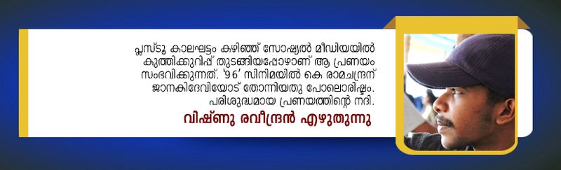 പ്ലസ്ടൂ കാലഘട്ടം കഴിഞ്ഞ് സോഷ്യല് മീഡിയയില് കുത്തിക്കുറിപ്പ് തുടങ്ങിയപ്പോഴാണ് ആ പ്രണയം സംഭവിക്കുന്നത്. '96' സിനിമയില് കെ രാമചന്ദ്രന് ജാനകിദേവിയോട് തോന്നിയതു പോലൊരിഷ്ടം. പരിശുദ്ധമായ പ്രണയത്തിന്റെ നദി.