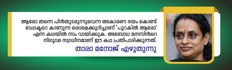 ആരോ തന്നെ പിന്തുടരുന്നുവെന്ന അകാരണ ഭയം കൊണ്ട് ഡോക്ടറെ കാണുന്ന ഒരാളെക്കുറിച്ചാണ് 'പുറകില് ആരോ' എന്ന കഥയില് നാം വായിക്കുക. അബോധ മനസിന്റെ നിഗൂഢ സ്വാധീനമാണ് ഈ കഥ പ്രതിപാദിക്കുന്നത്. മനസിന്റെ അബോധ തലങ്ങളിലേക്കുള്ള സഞ്ചാരമായ ഹിപ്നോട്ടിസത്തിലൂടെ ഈ കഥ മുന്നോട്ടുപോകുന്നു.