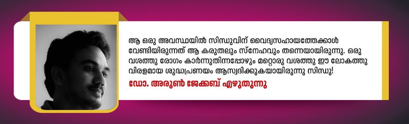 ആ ഒരു അവസ്ഥയിൽ സിന്ധുവിന് വൈദ്യസഹായത്തേക്കാൾ വേണ്ടിയിരുന്നത് ആ കരുതലും സ്നേഹവും തന്നെയായിരുന്നു. ഒരു വശത്തു രോഗം കാർന്നുതിന്നപ്പോഴും മറ്റൊരു വശത്തു ഈ ലോകത്തു വിരളമായ ശുദ്ധപ്രണയം ആസ്വദിക്കുകയായിരുന്നു സിന്ധു! പ്രണയം കൂടുതൽ കരുത്താർജിക്കുന്നത് ദാരിദ്ര്യത്തിലും, രോഗാവസ്ഥയിലുമാണെന്നു കേട്ടിട്ടുണ്ട്. വാനോളം പുകഴ്ത്തപ്പെടുന്ന സിനിമാപ്രണയങ്ങളേയും, എഴുത്തുകളെയും വെറും നിഷ്പ്രഭമാക്കുന്ന തീവ്രതയുണ്ടായിരുന്നു രോഗത്തിന്റെയും മരണത്തിന്റെയും പാപഭാരം ചുമക്കുന്ന മെഡിക്കൽ കോളേജ് വാർഡിലെ ആ രംഗത്തിന്.