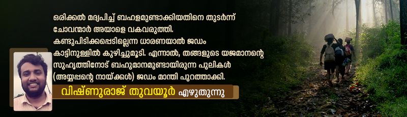 അങ്ങനെയിരിക്കെ, ഒരിക്കൽ മദ്യപിച്ച് ബഹളമുണ്ടാക്കിയതിനെ തുടർന്ന് ചോവന്മാർ അയാളെ വകവരുത്തി. കണ്ടുപിടിക്കപ്പെടില്ലെന്ന ധാരണയാൽ ജഡം കാട്ടിനുള്ളിൽ കുഴിച്ചുമൂടി. എന്നാൽ, തങ്ങളുടെ യജമാനന്റെ സുഹൃത്തിനോട് ബഹുമാനമുണ്ടായിരുന്ന പുലികൾ (അയ്യപ്പന്റെ നായ്ക്കൾ) ജഡം മാന്തി പുറത്താക്കി. കാട്ടാനകൾ ജഡം കണ്ടെത്തുകയും വെളിച്ചപ്പാടിന്റെ സുഹൃത്തുക്കൾ കാണാനിടയുള്ള ഒരിടത്തേക്ക് എടുത്തുകൊണ്ട് പോവുകയും ചെയ്തു. അപ്പോൾ ചോവർക്കിടയിൽ പടർന്നുപിടിച്ച വസൂരി, കോപിഷ്ടനായ ശാസ്താവ് (തിരുവിതാംകൂർ അതിർത്തിമലയിലെ ഈ ദൈവം ചാത്തൻ, സാത്താൻ, ശാസ്താൻ എന്നീ പേരുകളിലും അറിയപ്പെടുന്നു) അയച്ചതാണെന്ന് മറ്റൊരു വെളിച്ചപ്പാട് തുള്ളിപ്പറഞ്ഞു. മരിച്ച വെളിച്ചപ്പാടന്റെ ഒരു രൂപമുണ്ടാക്കി കൊലയാളികൾ ആരാധിക്കുവോളം വസൂരി ഒഴിഞ്ഞ് പോവുകയില്ലെന്നും അയാൾ പ്രഖ്യാപിച്ചു. ചോവർ രൂപമുണ്ടാക്കി, ഒരു പട്ടിക്കൂടിനോളം വലിപ്പമുള്ള ക്ഷേത്രത്തിൽ പ്രതിഷ്ഠിച്ചു. പിച്ചളകൊണ്ട് ഉണ്ടാക്കിയ ആ രൂപത്തിന് നാലിഞ്ചോളം ഉയരമുണ്ട്. താലനാനിയുടെ അനന്തരാവകാശി ആ ക്ഷേത്രത്തിലെ പൂജാരിയും അതിന്റെ ഗുണഭോക്താവുമായിത്തീർന്നു.' (പുറം 118-119)