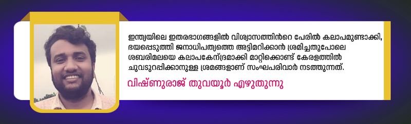 ഇന്ത്യയിലെ ഇതരഭാഗങ്ങളിൽ വിശ്വാസത്തിന്റെ പേരിൽ കലാപമുണ്ടാക്കി, ഭയപ്പെടുത്തി ജനാധിപത്യത്തെ അട്ടിമറിക്കാൻ ശ്രമിച്ചതുപോലെ ശബരിമലയെ കലാപകേന്ദ്രമാക്കി മാറ്റിക്കൊണ്ട് കേരളത്തിൽ ചുവടുറപ്പിക്കാനുള്ള ശ്രമങ്ങളാണ് സംഘപരിവാർ നടത്തുന്നത്. അതുകൊണ്ടാണ് ബി.ജെ.പി.യും അവരെ ഭരിക്കുന്ന ആർ.എസ്.എസും ആവശ്യപ്പെട്ടിരുന്ന യുവതീപ്രവേശനത്തെ ഇപ്പോൾ എതിർക്കുന്നത്. ആത്യന്തികമായി പരാജയപ്പെട്ടുപോകുന്ന അതിക്രമമാണ് ഇതെങ്കിലും സംസ്ഥാന പ്രസിഡന്റ് ശ്രീധരൻപിള്ള പറഞ്ഞതുപോലെ തങ്ങളുടെ ടാക്ടിക്സിൽ കുറേപ്പേരെ തട്ടിവീഴ്ത്താൻ അവർക്കായി.