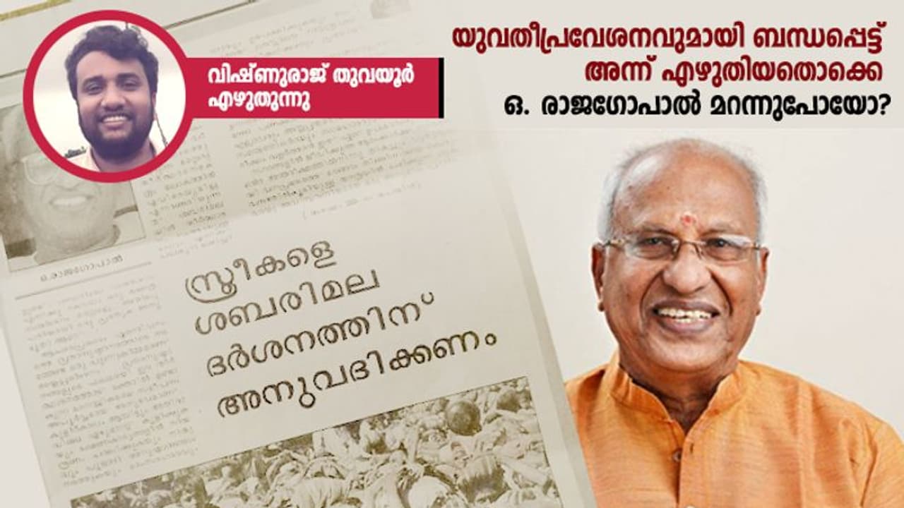 ഒ. രാജഗോപാലിനെ രാഷ്ട്രീയകേരളത്തിന് പറഞ്ഞു പരിചയപ്പെടുത്തേണ്ടതില്ലല്ലോ. ബി.ജെ.പി.യുടെ മുതിർന്ന നേതാവും മുൻ കേന്ദ്രമന്ത്രിയും കേരള നിയമസഭയിലെ ആദ്യ ബി.ജെ.പി. അംഗവുമായ രാജഗോപാൽ എഴുതിയ ഈ കുറിപ്പിന്റെ ശീർഷകം 'സ്ത്രീകളെ ശബരിമല ദർശനത്തിന് അനുവദിക്കണം' എന്നാണ്.