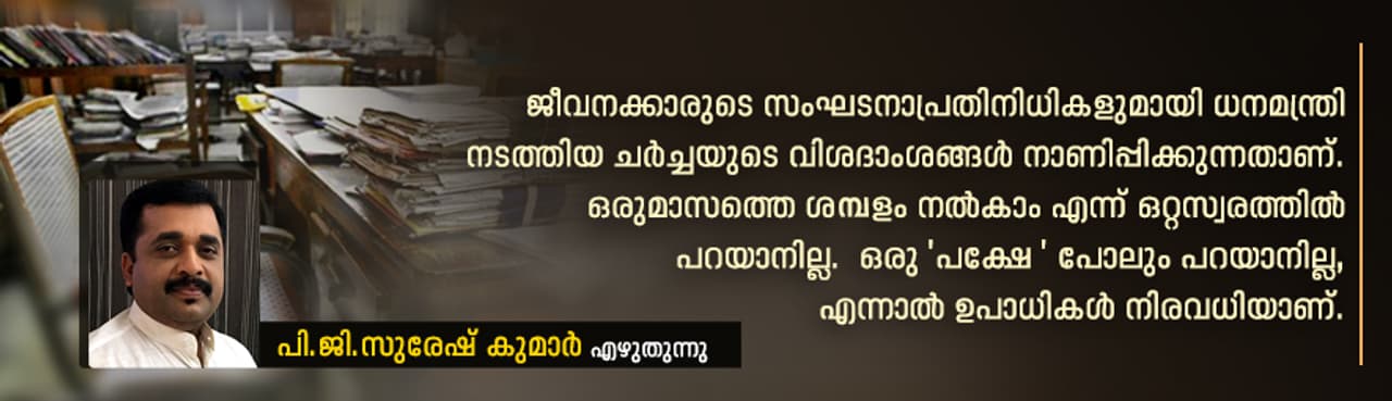 ജീവനക്കാരുടെ സംഘടനാപ്രതിനിധികളുമായി ധനമന്ത്രി നടത്തിയ ചർച്ചയുടെ വിശദാംശങ്ങള് നാണിപ്പിക്കുന്നതാണ്. ഒരുമാസത്തെ ശമ്പളം നല്കാം എന്ന് ഒറ്റസ്വരത്തില് പറയാനില്ല. ഒരു 'പക്ഷേ ' പോലും പറയാനില്ല, എന്നാൽ ഉപാധികൾ നിരവധിയാണ്.