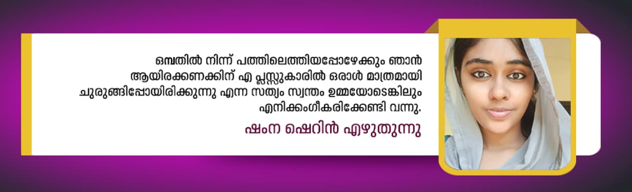 "സാരല്യ. പ്ലസ് ടു കഴിഞ്ഞിട്ട് ഇഷ്ടള്ളത് നോക്കാ. ഇപ്പൊ എന്തായാലും തുടങ്ങിലെ. ഇനി മുഴുവനാക്കിക്കൊ "എനിക്കും അത്രയെ ഉണ്ടായിരുന്നുള്ളു. ഏതായാലും തുടങ്ങി, അത് മുഴുവനാക്കുക. ഉമ്മയോടല്ലാതെ അന്നിത് ഉപ്പയോടോ, ഇത്തയോടോ ഒട്ടു പറഞ്ഞതുമില്ല. ഉമ്മാ എന്നാലും ഉപ്പയോട് സ്വകാര്യമായി "അവളെ ഇനി നിർബന്ധിക്കണ്ട, അവൾക്ക് ആകും എന്ന് തോന്നുന്നില്ല, ഇഷ്ടമുള്ളത് ചെയ്യട്ടെ" എന്ന് പറഞ്ഞിരുന്നു.