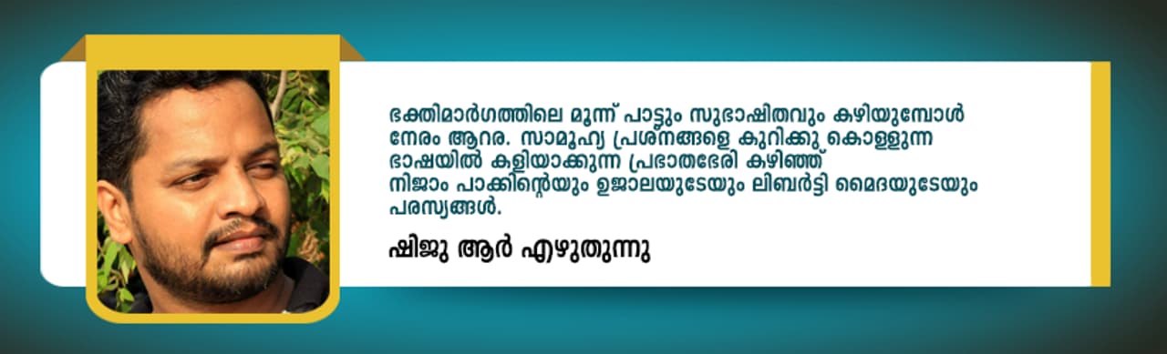 ഭക്തിമാർഗത്തിലെ മൂന്ന് പാട്ടും, സുഭാഷിതവും കഴിയുമ്പോൾ നേരം ആറര. സാമൂഹ്യപ്രശ്നങ്ങളെ കുറിക്കു കൊള്ളുന്ന ഭാഷയിൽ കളിയാക്കുന്ന പ്രഭാതഭേരി കഴിഞ്ഞ് നിജാം പാക്കിന്റെയും, ഉജാലയുടേയും, ലിബർട്ടി മൈദയുടേയും പരസ്യങ്ങൾ. ആറ് നാല്പത്തഞ്ചിന്റെ പ്രാദേശിക വാർത്തകൾ. നിർത്താതെ പെയ്ത് ഇരുതലയും മുട്ടുന്ന വെള്ളം കണ്ട് അവധി പ്രതീക്ഷിക്കുന്ന, സാധനം വാങ്ങാൻ വന്ന കുഞ്ഞുങ്ങൾ വാർത്ത കഴിയും വരെ ചുറ്റിപ്പറ്റി നിൽക്കും. അതെന്തിനാണെന്ന് കുമാരാട്ടനറിയാം. വാർത്ത കഴിഞ്ഞാൽ കുമാരാട്ടൻ പറയും. ''ഓടിക്ക പിളളറേ, ഇന്ന് ലീവൊന്നും പറഞ്ഞില്ല മ്മളെ കലട്ടറ്.'' കലക്ടറെന്ന ജീവിയെ മനസ്സിൽ പ്രാകി കുഞ്ഞുങ്ങൾ വീട്ടിലേക്കു പോവും.