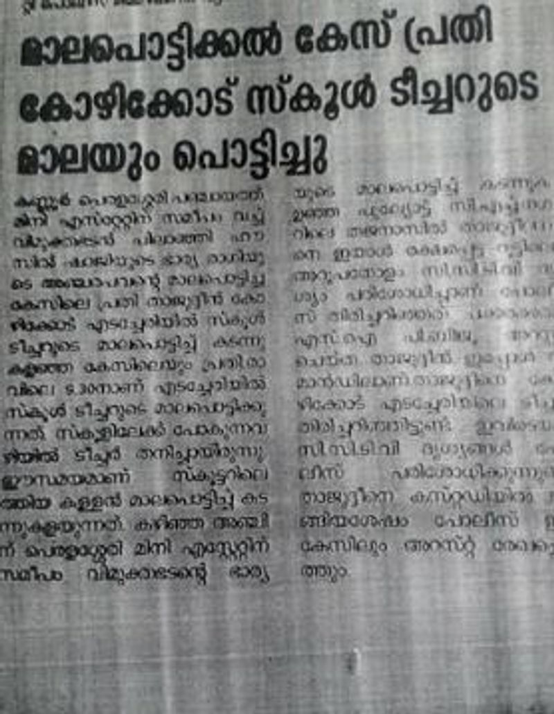 ജൂലൈ അഞ്ചാം തിയതി ഉച്ചയ്ക്ക് 12.15ന് വെളുത്ത സ്കൂട്ടറിലെത്തിയ ആൾ രാഗി എന്ന വീട്ടമ്മയുടെ അഞ്ചരപ്പവൻ വരുന്ന മാല പൊട്ടിച്ചെടുത്ത് രക്ഷപ്പെടുന്നു. സ്ഥലം പെരളശേരിയിലെ ചോരക്കളം. പ്രതി കണ്ടാലറിയാവുന്ന, കഷണ്ടിയുള്ള, കണ്ണട വെച്ച താടിക്കാരൻ. പൊലീസ് സി.സി.ടി.വികൾ പരിശോധിക്കുന്നു