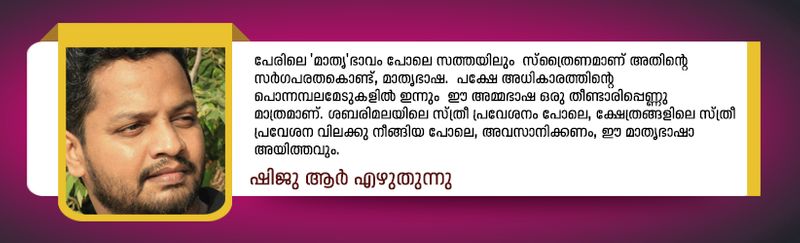 സ്ത്രീകള് ക്ഷേത്ര പ്രവേശനത്തിലനുഭവിക്കുന്ന വിലക്കുകള് ഭരണഘടനാ ദത്തമായ മൗലികാവകാശങ്ങളുടെ വെളിച്ചത്തില് സുപ്രീം കോടതി നീക്കം ചെയ്തല്ലോ. ആര്ത്തവമെന്ന സ്ത്രീയുടെ അമ്മയാവല് ശേഷിയാണല്ലോ ഈ വിലക്കിന്റെ അടിസ്ഥാനം. ആര്ജിക്കുന്ന അറിവുകള് സര്ഗ്ഗാത്മകമായി പുനരുല്പാദിപ്പിക്കാന് ശേഷി നല്കുന്ന ഭാഷയാണ് ഒരാളുടെ മാതൃഭാഷ. ഈ സൃഷ്ടിപരതയാണ് ഒരു വ്യക്തിയുടെ മാതൃഭാഷയെ അവള്ക്കറിയാവുന്ന മറ്റെല്ലാ ഭാഷകളില് നിന്നും വേറിട്ടതാക്കുന്നത് . പേരിലെ 'മാതൃ'ഭാവം പോലെ സത്തയിലും സ്ത്രൈണമാണ് അതിന്റെ സര്ഗപരതകൊണ്ട്, മാതൃഭാഷ. പക്ഷേ അധികാരത്തിന്റെ പൊന്നമ്പലമേടുകളില് ഇന്നും ഈ അമ്മഭാഷ ഒരു തീണ്ടാരിപ്പെണ്ണു മാത്രമാണ്. ശബരിമലയിലെ സ്ത്രീ പ്രവേശനം പോലെ, ക്ഷേത്രങ്ങളിലെ സ്ത്രീ പ്രവേശന വിലക്കു നീങ്ങിയ പോലെ, അവസാനിക്കണം, ഈ മാതൃഭാഷാ അയിത്തവും. അല്ലെങ്കില് നവംബര് ഒന്നിന്റെ മുണ്ടുടുപ്പും 'ഭരണഭാഷാ മാതൃഭാഷാ' പ്രഖ്യാപനങ്ങളുമെല്ലാം വെറും പ്രഹസനങ്ങളായിത്തീരും.