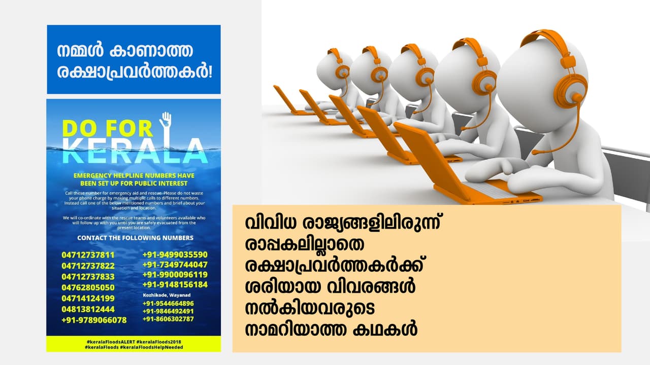 'ഈ നമ്പറിലേക്ക് വിളിക്കാം. ഫോണ് ഓഫായിപ്പോയാലും ലൊക്കേഷന് ട്രെയ്സ് ചെയ്തശേഷം രക്ഷാപ്രവര്ത്തകര് അരികിലെത്തും' നമ്മളിലെത്രയോ പേര് ഷെയര് ചെയ്ത മെസേജാണ്. ഓരോ കാള് കട്ടാകുമ്പോഴും കൃത്യമായ ലൊക്കേഷനുകള് ലാന്ഡ് മാര്ക്കടക്കം ട്രെയ്സ് ചെയ്തതും അത് രക്ഷാപ്രവര്ത്തകര്ക്ക് കൈമാറിയതും ഈ മനുഷ്യര് തന്നെയായിരുന്നു. ആവശ്യമുള്ള വളണ്ടിയര്മാരുടെ വിവരങ്ങള്, ഭക്ഷണസാധനങ്ങളുടെ വിവരങ്ങള് എല്ലാം ക്രോഡീകരിച്ചെടുത്തുമെല്ലാം ഇവര് തന്നെയായിരുന്നു.