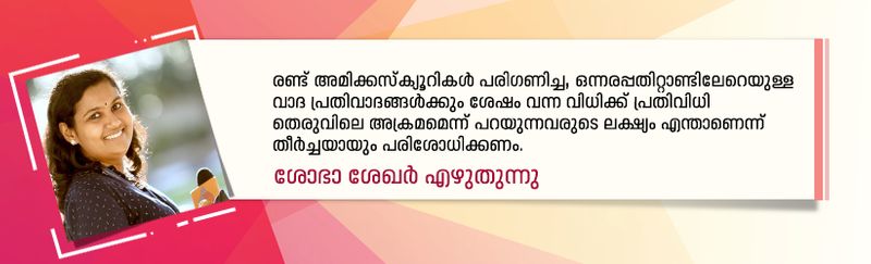 ആചാരസംരക്ഷണമെന്ന് അവകാശപ്പെട്ട് ജനക്കൂട്ടം തെരുവിൽ നടത്തുന്ന സമരങ്ങൾക്ക് പിന്നിലെ ഉദ്ദേശ്യമെന്താണ്? നവ ബ്രാഹ്മണിക്കൽ സമരമായി ഇത് മാറ്റപ്പെടുന്നുണ്ടോ? സ്ത്രീ പ്രവേശനം മാത്രമാണോ, കാതലായ പ്രശ്നം? സാമുദായിക - രാഷ്ട്രീയ കക്ഷികൾക്ക് സമരം കൊണ്ടുള്ള നേട്ടമെന്താണ്? ഇത് ചരിത്ര വിധിയായി മാറുന്നതെന്തുകൊണ്ട്? സുപ്രീം കോടതി വിധിയുടെ പശ്ചാത്തലത്തിൽ, സമൂഹത്തിന്റെ വിവിധ മേഖലകളെ വിധിന്യായം എങ്ങനെ ബാധിക്കുന്നുവെന്നതിന്റെ നേർക്കാഴ്ച; ഏഷ്യാനെറ്റ് ന്യൂസിലെ സീനിയർ പ്രോഗ്രാം പ്രൊഡ്യൂസർ ശോഭാ ശേഖർ എഴുതുന്നു.