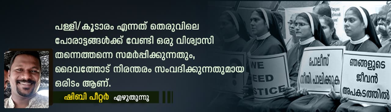 പള്ളി/കൂടാരം എന്നത് തെരുവിലെ പോരാട്ടങ്ങൾക്ക് വേണ്ടി ഒരു വിശ്വാസി തന്നെത്തന്നെ സമർപ്പിക്കുന്നതും, ദൈവത്തോട് നിരന്തരം സംവദിക്കുന്നതുമായ ഒരിടം ആണ്. തന്റെ നിയോഗത്തെ തിരയുന്ന ഒരുവളുടെ/ഒരുവന്റെ കത്തുന്ന മുൾപ്പടർപ്പ് ആണത്. ആ വിശുദ്ധ ഇടത്തെ അധികാരത്തിന്റെയും, സമ്പത്തിന്റെയും, ലൈംഗിക അതിക്രമങ്ങളുടെയും ഇടമാക്കി എന്നതാണ് ഇന്ന് തെരുവിൽ ചോദ്യം ചെയ്യപ്പെടുന്നത്.
