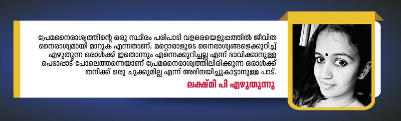 പ്രേമനൈരാശ്യത്തിന്റെ ഒരു സ്ഥിരം പരിപാടി വളരെയെളുപ്പത്തില് ജീവിത നൈരാശ്യമായി മാറുക എന്നതാണ്. മറ്റൊരാളുടെ നൈരാശ്യങ്ങളെക്കുറിച്ച് എഴുതുന്ന ഒരാള്ക്ക് ഇതൊന്നും എന്നെക്കുറിച്ചല്ല എന്ന് ഭാവിക്കാനുള്ള പെടാപ്പാട് പോലെത്തന്നെയാണ് പ്രേമനൈരാശ്യത്തിലിരിക്കുന്ന ഒരാള്ക്ക് തനിക്ക് ഒരു ചുക്കുമില്ല എന്ന് അഭിനയിച്ചുകാട്ടാനുള്ള പാട്. മുറിക്കുള്ളില് ഒറ്റക്കിരുന്നു കരഞ്ഞ്, പുറത്തിറങ്ങുമ്പോള് കരയാതിരിക്കുന്ന ഒരു മഹേഷുണ്ട്. മഹേഷിന്റെ പ്രതികാരത്തില് ഞാനേറ്റവും ഇഷ്ടപ്പെടുന്ന രംഗങ്ങള് മഹേഷ് ആ പെടാപ്പാട് പെടുന്ന രംഗങ്ങളാണ്. പലതവണ ഓടിക്കയറിയിരുന്ന പടവുകള് ക്ഷീണത്തോടെ അയാള് കയറുന്ന രംഗമാണ്.