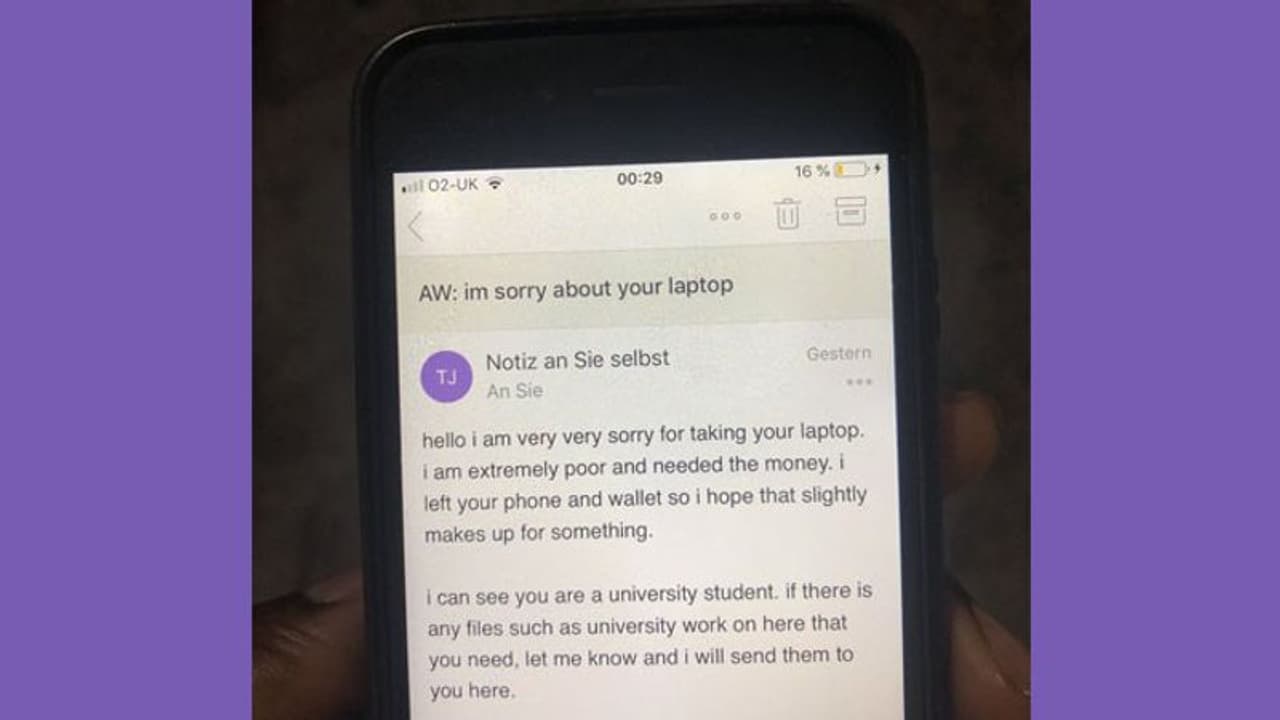 "ലാപ്ടോപ് മോഷ്ടിച്ചതിന് ക്ഷമ ചോദിക്കുന്നു. ഞാൻ വളരെ കഷ്ടത്തിലാണ്. എനിക്ക് പണം ആവശ്യമുണ്ട്. അതുകൊണ്ടാണ് ഞാൻ നിന്റെ ലാപ്ടോപ്പും പേഴ്സും മോഷ്ടിച്ചത്. എനിക്കറിയാം നീ സർവകലാശാല വിദ്യാർത്ഥിയാണ്. പഠനവുമായി ബന്ധപ്പെട്ട എന്തെങ്കിലും ഫയലുകൾ ഇതിൽ ഉണ്ടെങ്കിൽ ഞാൻ അത് നിനക്ക് അയച്ചു തരാം"- കള്ളൻ അയച്ച മെയിൽ പറയുന്നു.