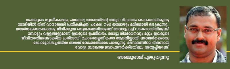 ഗംഗയുടെ ശുദ്ധീകരണം, പാരമ്പര്യ നഗരത്തിന്റെ സമഗ്ര വികസനം ഒക്കെയായിരുന്നു മോദിയില് നിന്ന് വാരാണസി പ്രതീക്ഷിച്ചത്. പക്ഷേ, ഗംഗ ഇപ്പോഴും മലിനമായി ഒഴുകുന്നു. സന്ദര്ശകരെക്കൊണ്ടു ജീവിക്കുന്ന ഒരുലക്ഷത്തിനടുത്ത് ഗേവാട്ടുകള് വാരണാസിയിലുണ്ട്. ബോട്ടും വള്ളങ്ങളുമാണ് ഇവരുടെ ഉപജീവനം. നോട്ടു നിരോധനവും മറ്റും ഇവരുടെ ജീവിതത്തിലുണ്ടാക്കിയ പ്രതിസന്ധി ചെറുതല്ലെന്ന് ഗംഗാ ആരതിയ്ക്കായി ഞങ്ങള്ക്കൊപ്പം ബോട്ടോടിച്ചെത്തിയ അയജ് രോഷത്തോടെ പറയുന്നു. മണ്ഡലത്തിലെ നിര്ണായ വോട്ടു ബാങ്കായ ബ്രാഹ്മണര്ക്കിടയിലും അതൃപ്തിയുണ്ട്.