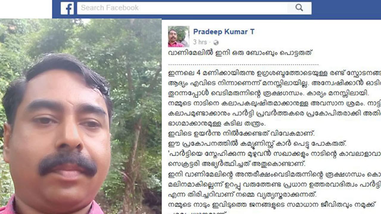 സ്വന്തം വീടിനു നേര്ക്കു നടന്ന ബോംബാക്രമണത്തിനു തൊട്ടു പിന്നാലെ ചെറുമോത്ത് എല്.പി സ്കൂള് അധ്യാപകനും സിപിഎം ലോക്കല് കമ്മിറ്റി സെക്രട്ടറിയുമായ പ്രദീപ് കുമാര് എഴുതിയ ഫേസ്ബുക്ക് പോസ്റ്റ് ഇതാ ഇവിടെ: